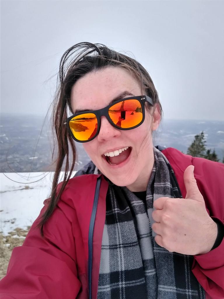 I made a loop around the top of the summit, as snow powdered my hair and wind—stronger here than it’d been below the tree line, but not unbearable—bit at my cheeks. The view, blue-ridged and whatever the most complimentary way you can say dreary is, stretched out gorgeous from every angle. Grey, distant, and utterly beautiful.