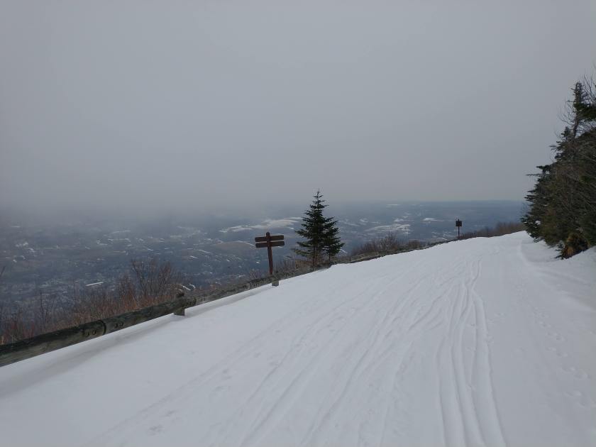 Greylock’s summit is a somewhat deceptive thing. You don’t reach a peak, so much as you break out of the trees onto a road. In the summer, you can drive to the top, but here in March, it’s still covered in snow.