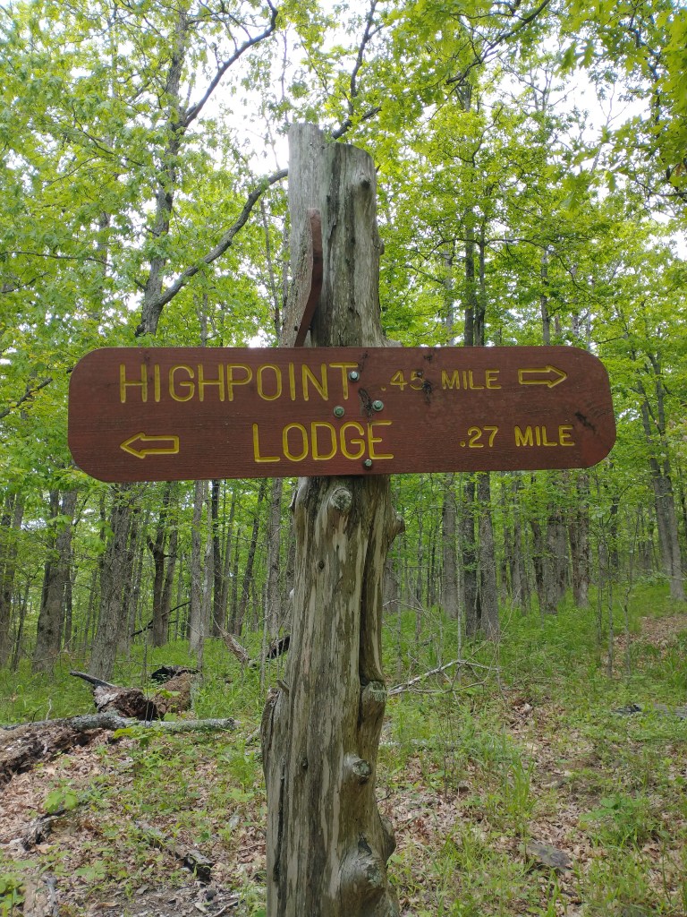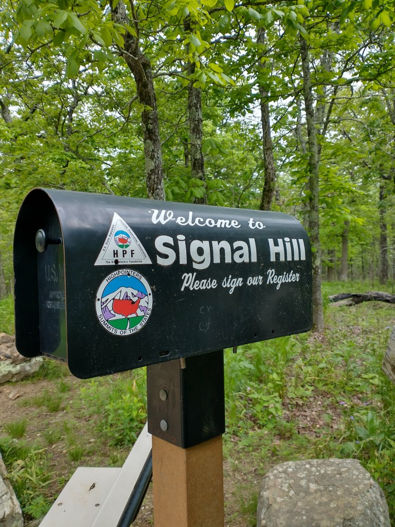 Finally, we hopped out of the Suffering Bus at the campground, at the start of Signal Hill Trail. It would be short jaunt to the highpoint, and the park staff had advised that the more scenic areas were best found by the lodge, slightly further down the mountain. As such, we planned to split our hike into two parts. First, the highpoint, to achieve Tallest People in the State status, even if only for a glimmering moment, and then second, to a shorter trail along the ridge with the views. With this determined, we set out on Signal Hill Trail with the whole posse of family in tow.