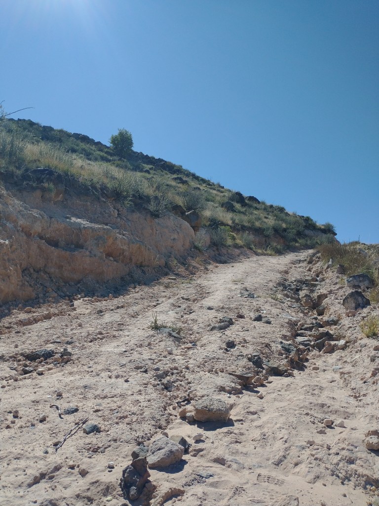 After a few calm miles of dusty, flat, and rock-strewn terrain, the trail turned upwards towards the only real incline we’d encounter on this highpoint trail. A wide rocky track wound sharply upwards in a couple of firm switchbacks that would take the air out of your lungs real quickly if you took them at a challenging pace.